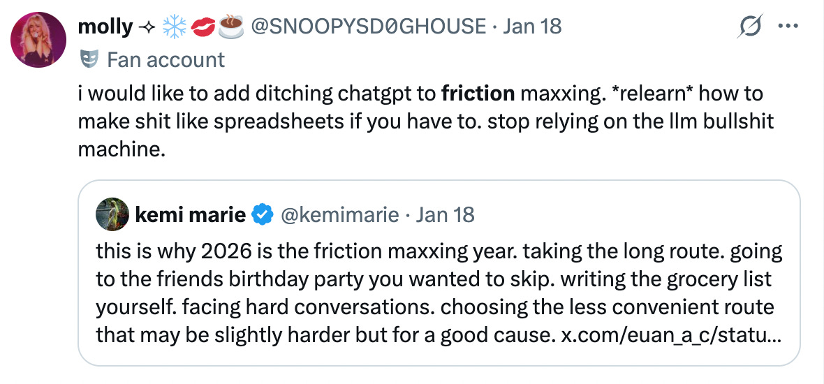 Friction maxing. TBH, I love making my own plans, processes, and spreadsheets, and I’m not giving it up in 2026.