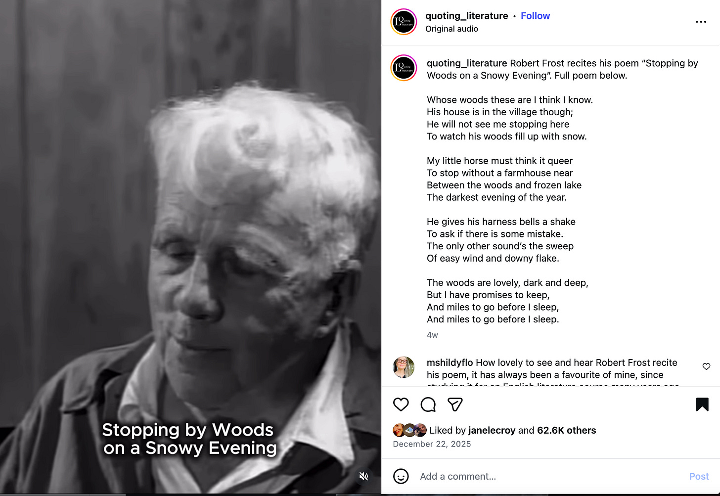 Robert Frost reading his iconic winter poem. Listen here.